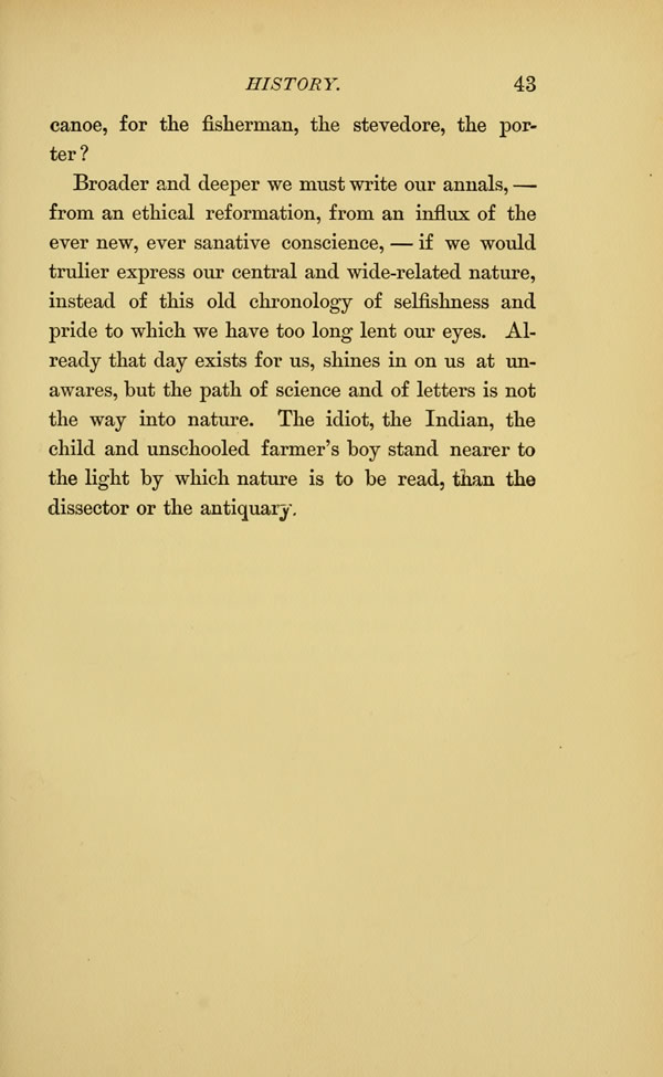 Broader and deeper we must write our annals, from an ethical reformation, from an influx of the ever new, ever sanative conscience, -- if we would trulier express our central and wide-related nature, instead of this old chronology of selfishness and pride to which we have too long lent our eyes. Already that day exists for us, shines in on us at unawares, but the path of science and of letters is not the way into nature. The idiot, the Indian, the child and unschooled farmer's boy stand nearer to the light by which nature is to be read, than the dissector or the antiquary,