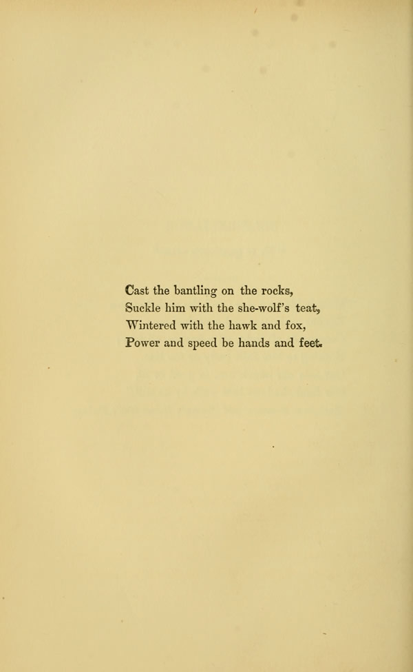 Cast the banding on the rocks, Suckle him with the she-wolf's teat, Wintered with the hawk and fox, Power and speed be hands and feet.