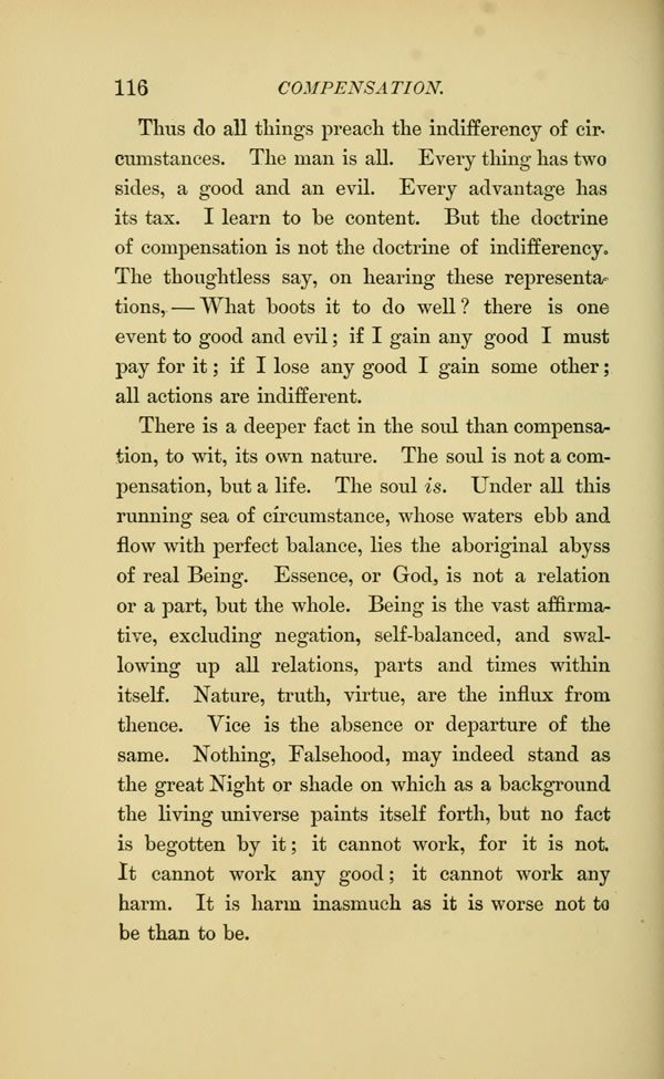The soul is not a compensation, but a life. The soul is. Under all this running sea of circumstance, whose waters ebb and flow with perfect balance, lies the aboriginal abyss of real Being. Essence, or God, is not a relation or a part, but the whole. Being is the vast affirmative, excluding negation, self-balanced, and swallowing up all relations, parts and times within itself. Nature, truth, virtue, are the influx from thence. Vice is the absence or departure of the same. Nothing, Falsehood, may indeed stand as the great Night or shade on which as a background the living universe paints itself forth, but no fact is begotten by it; it cannot work, for it is not. It cannot work any good; it cannot work any harm. It is harm inasmuch as it is worse not to be than to be.