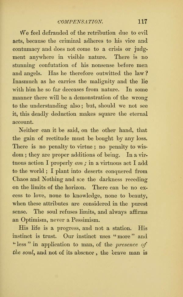 We feel defrauded of the retribution due to evil acts, because the criminal adheres to his vice and contumacy and does not come to a crisis or judgment anywhere in visible nature. There is no stunning confutation of his nonsense before men and angels. Has he therefore outwitted the law? Inasmuch as he carries the malignity and the lie with him he so far deceases from nature. In some manner there will be a demonstration of the wrong to the understanding also; but, should we not see it, this deadly deduction makes square the eternal account.