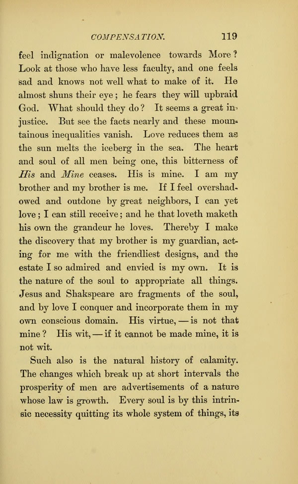 His and Mine ceases. His is mine. I am my brother and my brother is me. If I feel overshadowed and outdone by great neighbors, I can yet love; I can still receive and he that loveth maketh his own the grandeur he loves. Thereby I make the discovery that my brother is my guardian, acting for me with the friendliest designs, and the estate I so admired and envied is my own. It is the nature of the soul to appropriate all things.