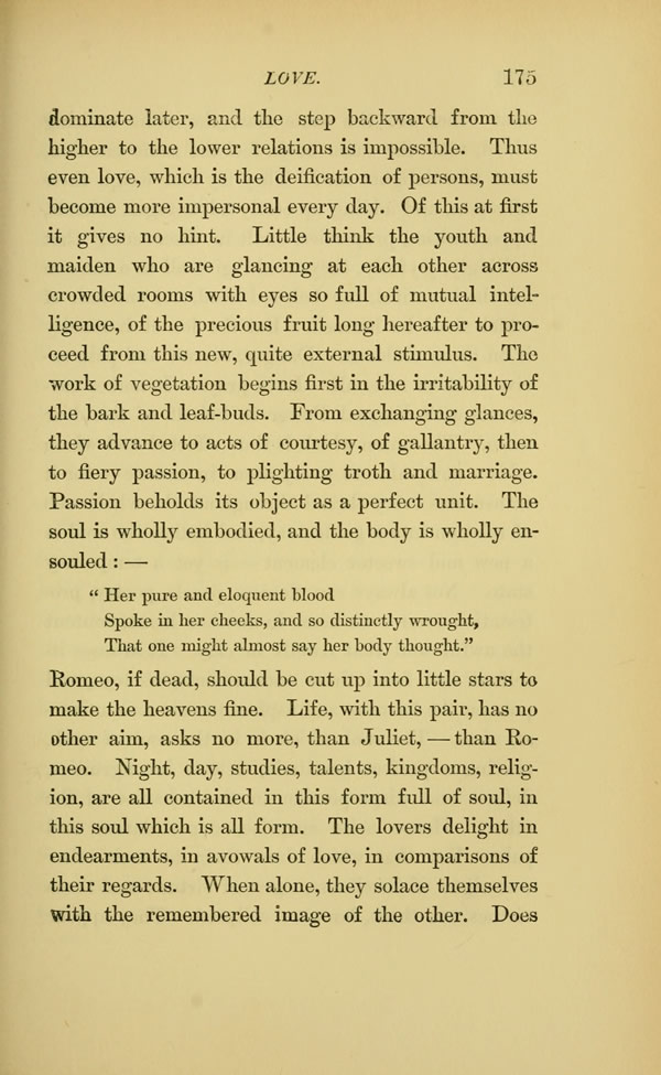 Romeo, if dead, should be cut up into little stars to make the heavens fine. Life, with this pair, has no other aim, asks no more, than Juliet, -- than Romeo. Night, day, studies, talents, kingdoms, religion, are all contained in this form full of soul, in this soul which is all form. The lovers delight in endearments, in avowals of love, in comparisons of their regards. When alone, they solace themselves with the remembered image of the other. Does