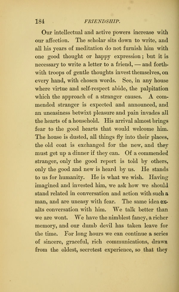 Our intellectual and active powers increase with our affection. The scholar sits down to write, and all his years of meditation do not furnish him with one good thought or happy expression; but it is necessary to write a letter to a friend, -- and forth with troops of gentle thoughts invest themselves, on every hand, with chosen words. See, in any house where virtue and self-respect abide, the palpitation which the approach of a stranger causes. A commended stranger is expected and announced, and an uneasiness betwixt pleasure and pain invades all the hearts of a household. His arrival almost brings fear to the good hearts that would welcome him.