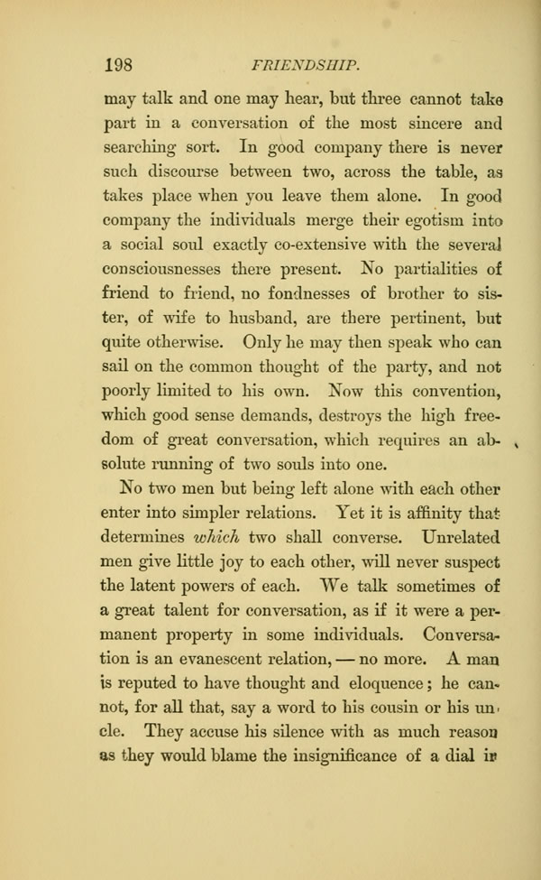 may talk and one may hear, but three cannot take part in a conversation of the most sincere and searching sort. In good company there is never such discourse between two, across the table, as takes place when you leave them alone. In good company the individuals merge their egotism into a social soul exactly co-extensive with the several consciousnesses there present. No partialities of friend to friend, no fondnesses of brother to sister, of wife to husband, are there pertinent, but quite otherwise. Only he may then speak who can sail on the common thought of the party, and not poorly limited to his own. Now this convention, which good sense demands, destroys the high freedom of great conversation, which requires an absolute running of two souls into one.