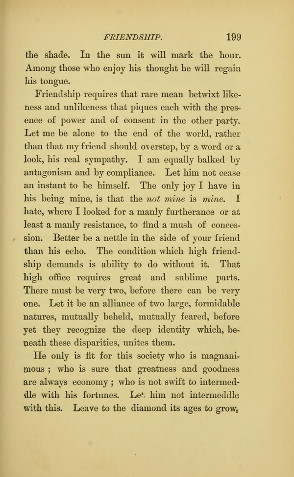 Let me be alone to the end of the world, rather than that my friend should overstep, by a word or a look, his real sympathy. I am equally balked by antagonism and by compliance. Let him not cease an instant to be himself. The only joy I have in his being mine, is that the not mine is mine. I hate, where I looked for a manly furtherance or at least a manly resistance, to find a mush of concession. Better be a nettle in the side of your friend than his echo. The condition which high friendship demands is ability to do without it. That high office requires great and sublime parts.