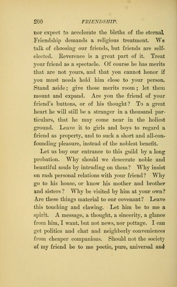 Let us buy our entrance to this guild by a long probation. Why should we desecrate noble and beautiful souls by intruding on them? Why insist on rash personal relations with your friend? Why go to his house, or know his mother and brother and sisters? Why be visited by him at your own?