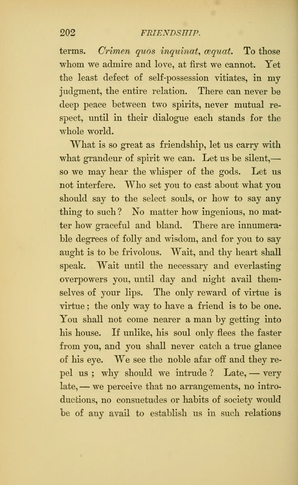 terms. Crimen quos inquinat, cequat. To those whom we admire and love, at first we cannot. Yet the least defect of self-possession vitiates, in my judgment, the entire relation. There can never be deep peace between two spirits, never mutual respect, until in their dialogue each stands for the whole world.