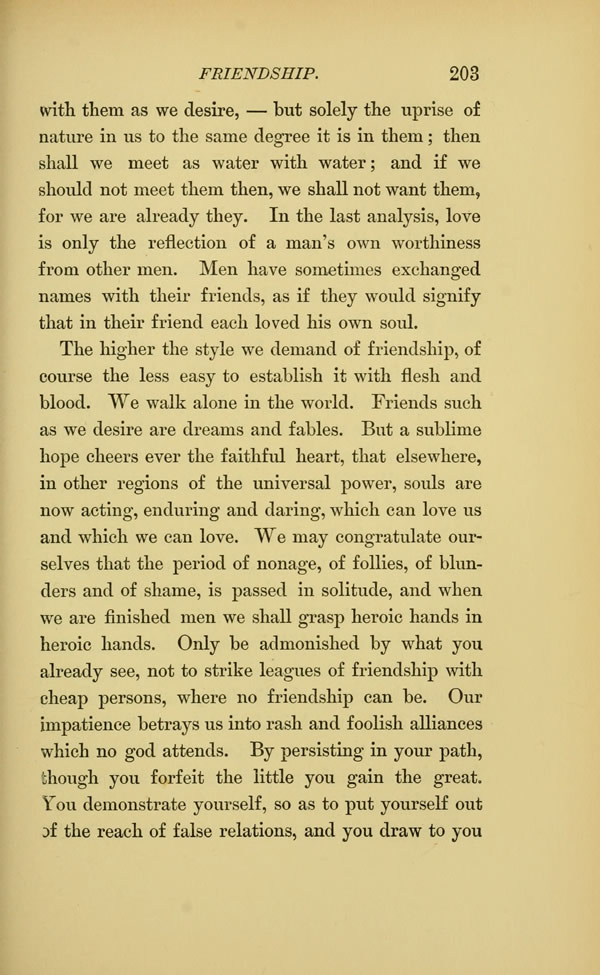 The higher the style we demand of friendship, of course the less easy to establish it with flesh and blood. We walk alone in the world. Friends such as we desire are dreams and fables. But a sublime hope cheers ever the faithful heart, that elsewhere, in other regions of the universal power, souls are now acting, enduring and daring, which can love us and which we can love. We may congratulate ourselves that the period of nonage, of follies, of blunders and of shame, is passed in solitude, and when we are finished men we shall grasp heroic hands in heroic hands. Only be admonished by what you already see, not to strike leagues of friendship with cheap persons, where no friendship can be. Our impatience betrays us into rash and foolish alliances which no god attends. By persisting in your path, though you forfeit the little you gain the great. You demonstrate yourself, so as to put yourself out pf the reach of false relations, and you draw to you