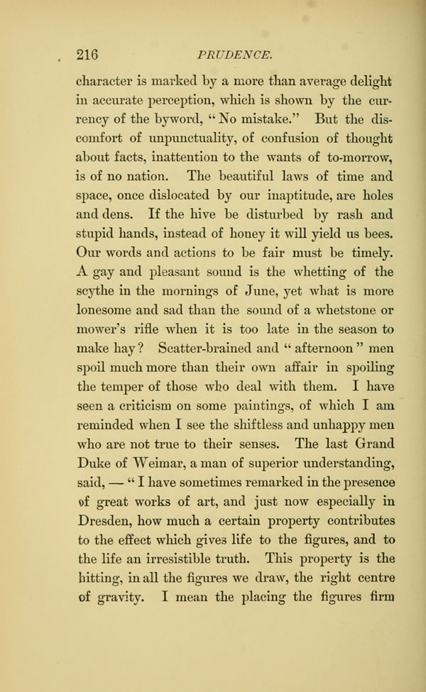A gay and pleasant sound is the whetting of the scythe in the mornings of June, yet what is more lonesome and sad than the sound of a whetstone or mower's rifle when it is too late in the season to make hay? Scatter-brained and "afternoon" men spoil much more than their own affair in spoiling the temper of those who deal with them. I have seen a criticism on some paintings, of which I am reminded when I see the shiftless and unhappy men who are not true to their senses. The last Grand Duke of Weimar, a man of superior understanding, said, -- "I have sometimes remarked in the presence of great works of art, and just now especially in Dresden, how much a certain property contributes to the effect which gives life to the figures, and to the life an irresistible truth. This property is the hitting, in all the figures we draw, the right centre of gravity. I mean the placing the figures firm