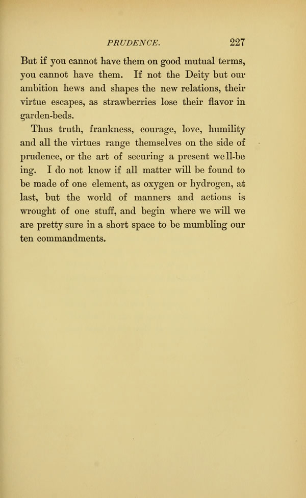 Thus truth, frankness, courage, love, humility and all the virtues range themselves on the side of prudence, or the art of securing a present well being. I do not know if all matter will be found to be made of one element, as oxygen or hydrogen, at last, but the world of manners and actions is wrought of one stuff, and begin where we will we are pretty sure in a short space to be mumbling our ten commandments.