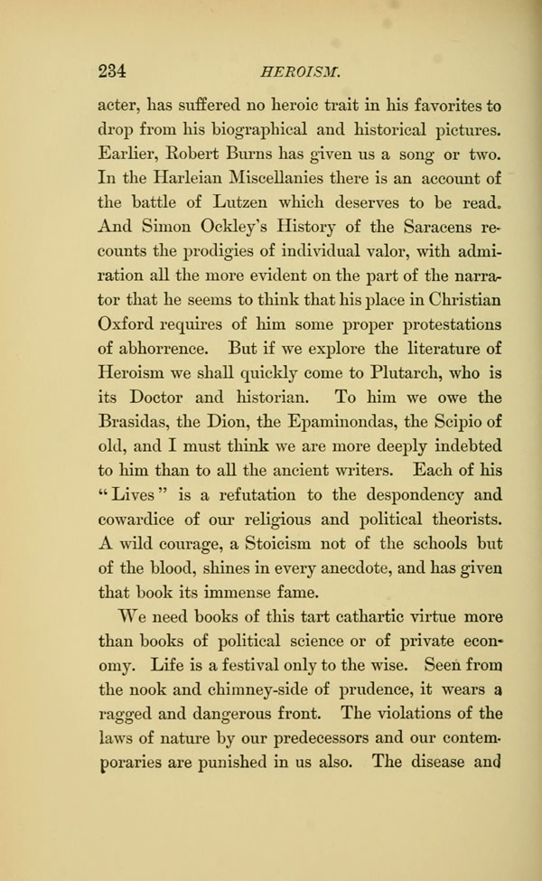 And Simon Ockley's History of the Saracens recounts the prodigies of individual valor, with admiration all the more evident on the part of the narrator that he seems to think that his place in Christian Oxford requires of him some proper protestations of abhorrence. But if we explore the literature of Heroism we shall quickly come to Plutarch, who is its Doctor and historian. To him we owe the Brasidas, the Dion, the Epaminondas, the Scipio of old, and I must think we are more deeply indebted to him than to all the ancient writers. Each of his "Lives" is a refutation to the despondency and cowardice of our religious and political theorists.
