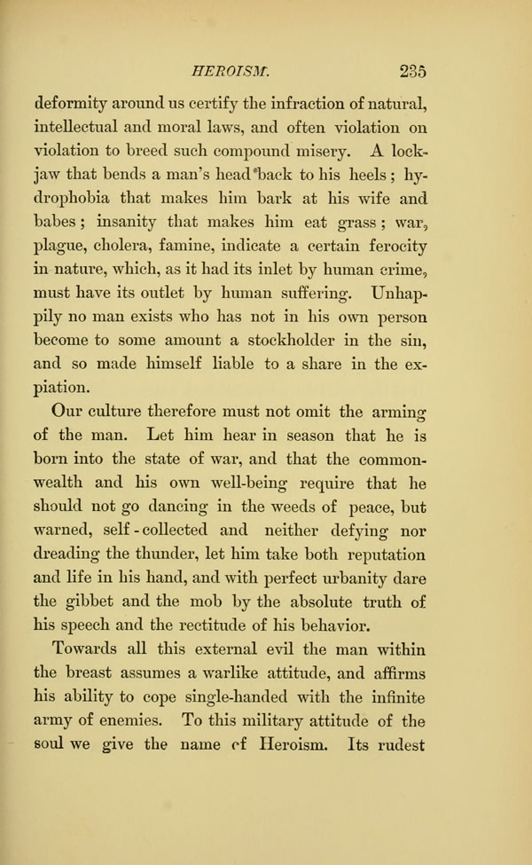 Towards all this external evil the man within the breast assumes a warlike attitude, and affirms his ability to cope single-handed with the infinite army of enemies. To this military attitude of the soul we give the name of Heroism. Its rudest