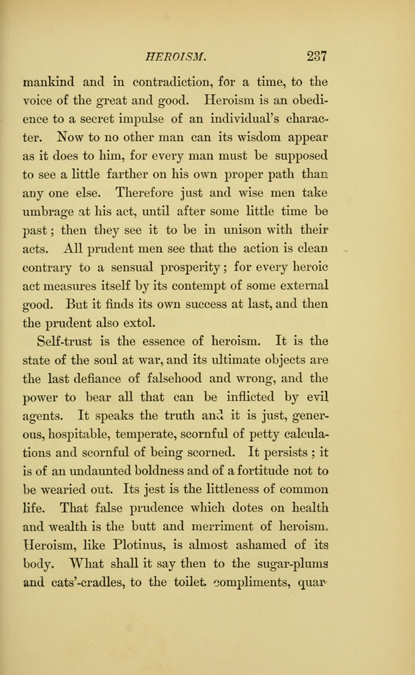 Self-trust is the essence of heroism. It is the state of the soul at war, and its ultimate objects are the last defiance of falsehood and wrong, and the power to bear all that can be inflicted by evil agents. It speaks the truth and it is just, generous, hospitable, temperate, scornful of petty calculations and scornful of being scorned. It persists; it is of an undaunted boldness and of a fortitude not to be wearied out. Its jest is the littleness of common life. That false prudence which dotes on health and wealth is the butt and merriment of heroism.