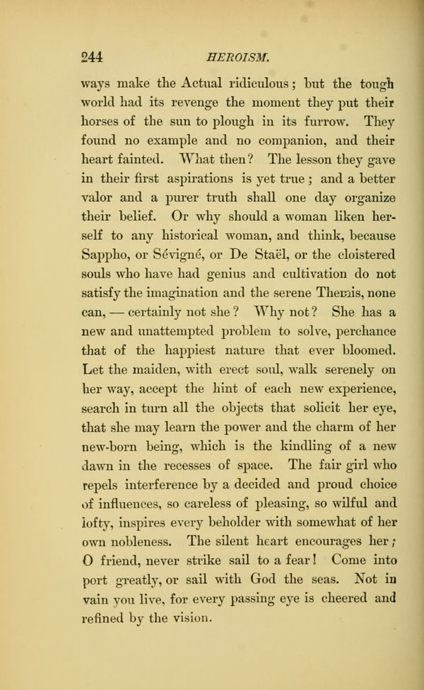 make the Actual ridiculous; but the tough world had its revenge the moment they put their horses of the sun to plough in its furrow. They found no example and no companion, and their heart fainted. What then? The lesson they gave in their first aspirations is yet true; and a better valor and a purer truth shall one day organize their belief. Or why should a woman liken herself to any historical woman, and think, because Sappho, or Sevigne, or De Stael, or the cloistered souls who have had genius and cultivation do not satisfy the imagination and the serene Themis, none can, -- certainly not she? Why not? She has a new and unattempted problem to solve, perchance that of the happiest nature that ever bloomed.