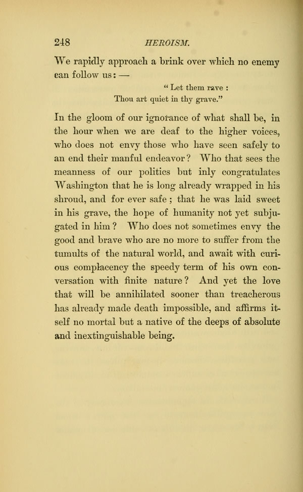 In the gloom of our ignorance of what shall be, in the hour when we are deaf to the higher voices, who does not envy those who have seen safely to an end their manful endeavor? Who that sees the meanness of our politics but inly congratulates Washington that he is long already wrapped in his shroud, and for ever safe; that he was laid sweet in his grave, the hope of humanity not yet subjugated in him? Who does not sometimes envy the good and brave who are no more to suffer from the tumults of the natural world, and await with curious complacency the speedy term of his own conversation with finite nature? And yet the love that will be annihilated sooner than treacherous has already made death impossible, and affirms itself no mortal but a native of the deeps of absolute and inextinguishable being.