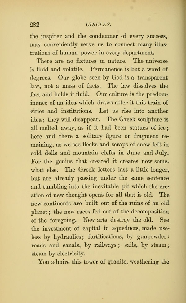 There are no fixtures in nature. The universe is fluid and volatile. Permanence is but a word of degrees. Our globe seen by God is a transparent law, not a mass of facts. The law dissolves the fact and holds it fluid. Our culture is the predominance of an idea which draws after it this train of cities and institutions. Let us rise into another idea; they will disappear. The Greek sculpture is all melted away, as if it had been statues of ice here and there a solitary figure or fragment remaining, as we see flecks and scraps of snow left in cold dells and mountain clefts in June and July.
