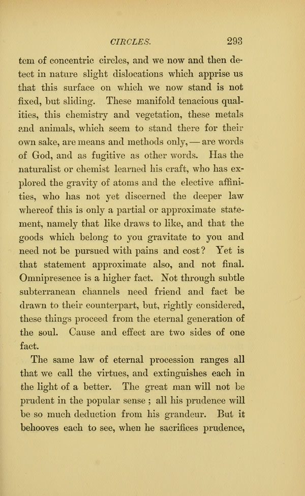of concentric circles, and we now and then detect in nature slight dislocations which apprise us that this surface on which we now stand is not fixed, but sliding. These manifold tenacious qualities, this chemistry and vegetation, these metals and animals, which seem to stand there for their own sake, are means and methods only, -- are words of God, and as fugitive as other words. Has the naturalist or chemist learned his craft, who has explored the gravity of atoms and the elective affinities, who has not yet discerned the deeper law whereof this is only a partial or approximate statement, namely that like draws to like, and that the goods which belong to you gravitate to you and need not be pursued with pains and cost? Yet is that statement approximate also, and not final.