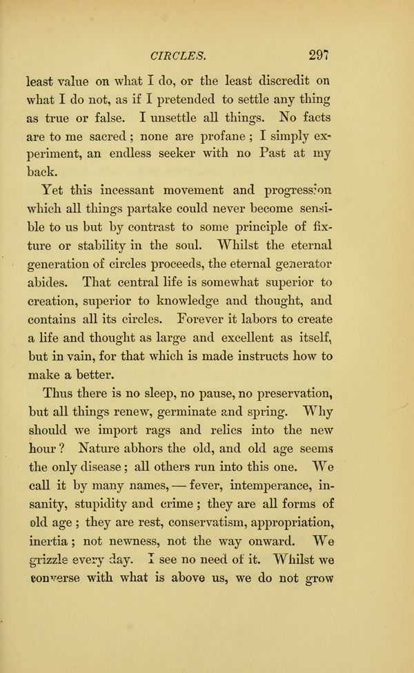 Thus there is no sleep, no pause, no preservation, but all things renew, germinate and spring. Why should we import rags and relics into the new hour? Nature abhors the old, and old age seems the only disease; all others run into this one. We call it by many names, -- fever, intemperance, insanity, stupidity and crime; they are all forms of old age they are rest, conservatism, appropriation, inertia; not newness, not the way onward. We grizzle every day. I see no need of it. Whilst we converse with what is above us, we do not grow