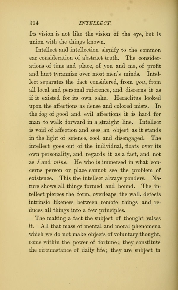 Intellect and intellection signify to the common ear consideration of abstract truth. The considerations of time and place, of you and me, of profit and hurt tyrannize over most men's minds. Intellect separates the fact considered, from you, from all local and personal reference, and discerns it as if it existed for its own sake. Heraclitus looked upon the affections as dense and colored mists. In the fog of good and evil affections it is hard for man to walk forward in a straight line. Intellect is void of affection and sees an object as it stands in the light of science, cool and disengaged. The intellect goes out of the individual, floats over its own personality, and regards it as a fact, and not as I and mine. He who is immersed in what concerns person or place cannot see the problem of existence. This the intellect always ponders. Nature shows all things formed and bound. The intellect pierces the form, overleaps the wall, detects intrinsic likeness between remote things and reduces all things into a few principles.