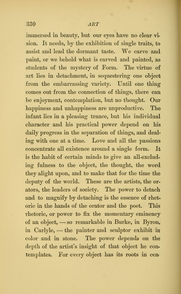 immersed in beauty, but our eyes have no clear vision. It needs, by the exhibition of single traits, to assist and lead the dormant taste. We carve and paint, or we behold what is carved and painted, as students of the mystery of Form. The virtue of art lies in detachment, in sequestering one object from the embarrassing variety. Until one thing comes out from the connection of things, there can be enjoyment, contemplation, but no thought. Our happiness and unhappiness are unproductive. The infant lies in a pleasing trance, but his individual character and his practical power depend on his daily progress in the separation of things, and dealing with one at a time. Love and all the passions concentrate all existence around a single form. It is the habit of certain minds to give an all-excluding fulness to the object, the thought, the word they alight upon, and to make that for the time the deputy of the world. These are the artists, the orators, the leaders of society. The power to detach and to magnify by detaching is the essence of rhetoric in the hands of the orator and the poet. This rhetoric, or power to fix the momentary eminency of an object, so remarkable in Burke, in Byron, in Carlyle, -- the painter and sculptor exhibit in color and in stone. The power depends on the depth of the artist's insight of that object he con. templates. For every object has its roots in central