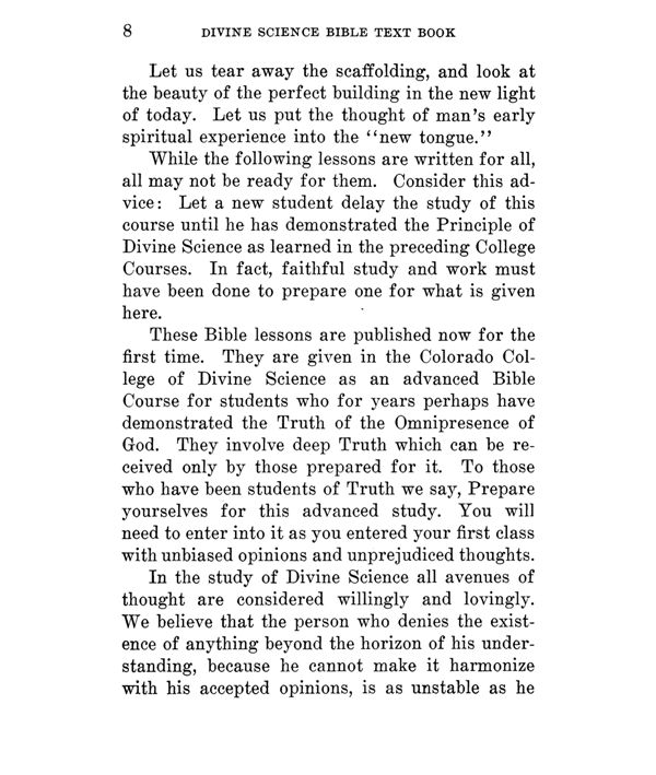 These Bible lessons are published now for the first time. They are given in the Colorado College of Divine Science as an advanced Bible Course for students who for years perhaps have demonstrated the Truth of the Omnipresence of God. They involve deep Truth which can he received only by those prepared for it. To those who have been students of Truth we say, Prepare yourselves for this advanced study. You will need to enter into it as you entered your first class with unbiased opinions and unprejudiced thoughts.