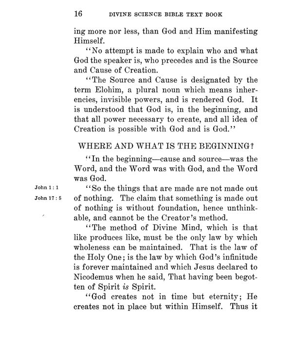 "The Source and Cause is designated by the term Elohim, a plural noun which means inherencies, invisible powers, and is rendered God. It is understood that God is, in the beginning, and that all power necessary to create, and all idea of Creation is possible with God and is God."