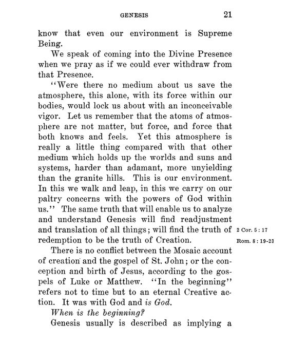 "Were there no medium about us save the atmosphere, this alone, with its force within our bodies, would lock us about with an inconceivable vigor. Let us remember that the atoms of atmosphere are not matter, but force, and force that both knows and feels. Yet this atmosphere is really a little thing compared with that other medium which holds up the worlds and suns and systems, harder than adamant, more unyielding than the granite hills. This is our environment. In this we walk and leap, in this we carry on our paltry concerns with the powers of God within us." The same truth that will enable us to analyze and understand Genesis will find readjustment and translation of all things; will find the truth of redemption to be the truth of Creation.