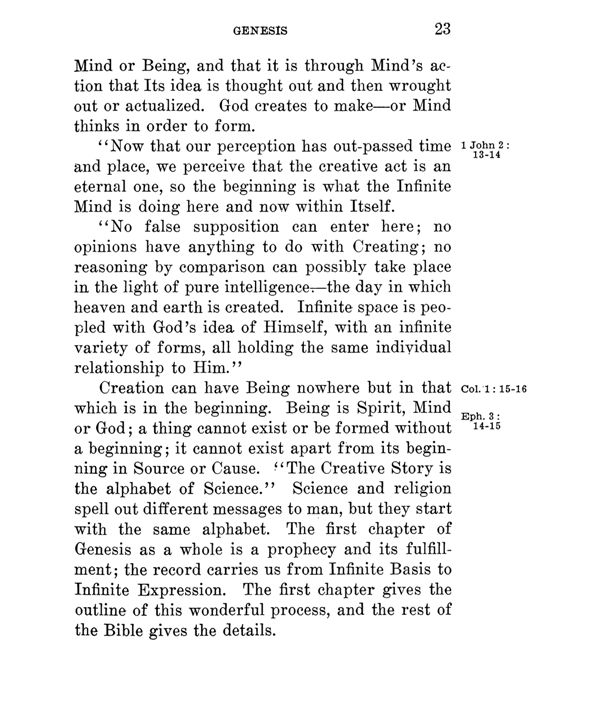 Creation can have Being nowhere but in that which is in the beginning. Being is Spirit, Mind or God a thing cannot exist or be formed without a beginning; it cannot exist apart from its beginning in Source or Cause. `` The Creative Story is the alphabet of Science." Science and religion spell out different messages to man, but they start with the same alphabet. The first chapter of Genesis as a whole is a prophecy and its fulfillment; the record carries us from Infinite Basis to Infinite Expression. The first chapter gives the outline of this wonderful process, and the rest of the Bible gives the details.