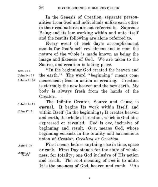 The Infinite Creator, Source and Cause, is eternal. It begins Its work within Itself, and within Itself (in the beginning); It creates heaven and earth, the whole of creation, which is God idea expressed or revealed. God is one, inclusive of beginning and result. One, means God, whose beginning consists in the totality and harmonious union of Creator, Creating or Creation.