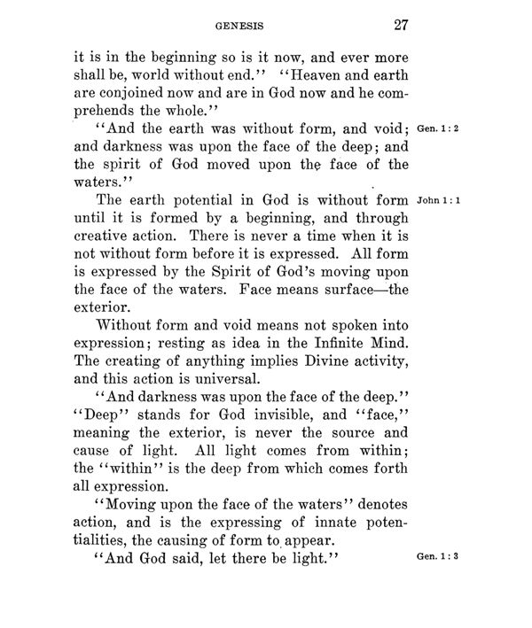 "And darkness was upon the face of the deep." "Deep" stands for God invisible, and "face," meaning the exterior, is never the source and cause of light. All light comes from within; the "within" is the deep from which comes forth all expression.
