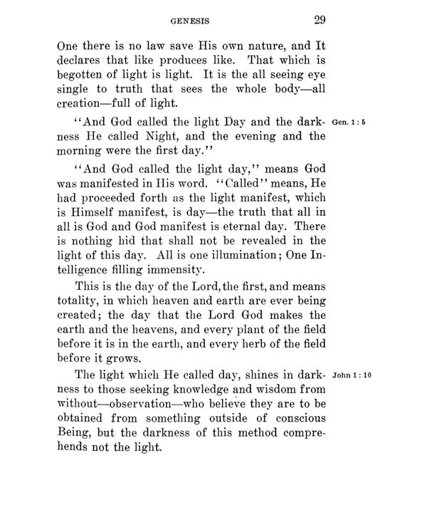 The light which He called day, shines in darkness to those seeking knowledge and wisdom from without --- observation --- who believe they are to be obtained from something outside of conscious Being, but the darkness of this method comprehends not the light.