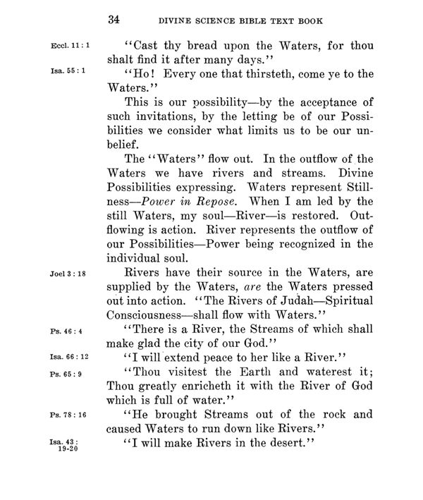 This is our possibility --- by the acceptance of such invitations, by the letting be of our Possibilities we consider what limits us to be our unbelief. The "Waters" flow out. In the outflow of the Waters we have rivers and streams. Divine Possibilities expressing. Waters represent Stillness --- Power in Repose. When I am led by the still Waters, my soul --- River --- is restored. Outflowing is action. River represents the outflow of our Possibilities --- Power being recognized in the individual soul.