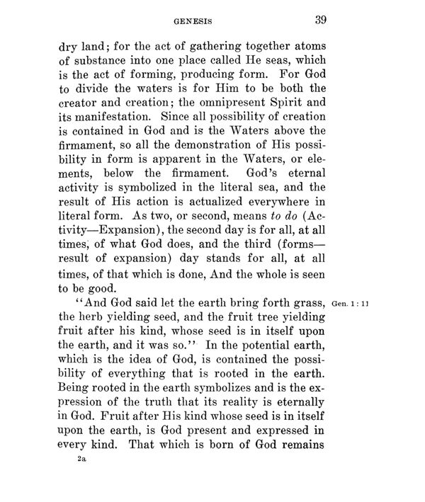 dry land; for the act of gathering together atoms of substance into one place called He seas, which is the act of forming, producing form. For God to divide the waters is for Him to be both the creator and creation; the omnipresent Spirit and its manifestation. Since all possibility of creation is contained in God and is the Waters above the firmament, so all the demonstration of His possibility in form is apparent in the Waters, or elements, below the firmament. God's eternal activity is symbolized in the literal sea, and the result of His action is actualized everywhere in literal form. As two, or second, means to do (Activity --- Expansion), the second day is for all, at all times; of what God does, and the third (forms -- result of expansion) day stands for all, at all times, of that which is done, And the whole is seen to be good.