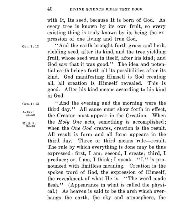 "And the evening and the morning were the third day." All cause must show forth in effect, the Creator must appear in the Creation. When the Holy One acts, something is accomplished; when the One God creates, creation is the result. All result is form and all form appears in the third day. Three or third means rule --- result. The rule by which everything is done may be thus expressed: first, I am; second, I create; third, I produce; or, I am, I think; I speak. "I," is pronounced with limitless meaning. Creation is the spoken word of God, the expression of Himself, the revealment of what He is. "The word made flesh." (Appearance in what is called the physical.) As heaven is said to be the arch which overhangs the earth, the sky and atmosphere, the