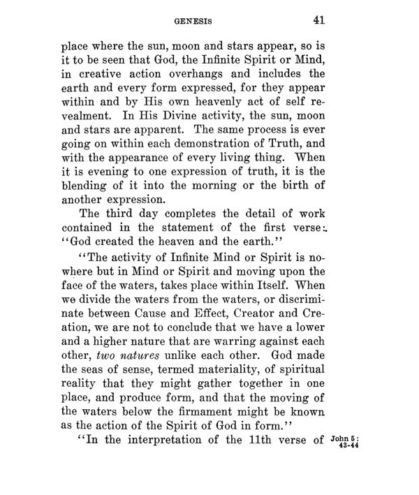 "The activity of Infinite Mind or Spirit is nowhere but in Mind or Spirit and moving upon the face of the waters, takes place within Itself. When we divide the waters from the waters, or discriminate between Cause and Effect, Creator and Creation, we are not to conclude that we have a lower and a higher nature that are warring against each other, two natures unlike each other. God made the seas of sense, termed materiality, of spiritual reality that they might gather together in one place, and produce form, and that the moving of the waters below the firmament might be known as the action of the Spirit of God in form."