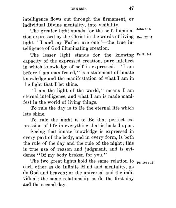 The two great lights hold the same relation to each other as do Infinite Mind and mentality, as do God and heaven; or the universal and the individual; the same relationship as do the first day and the second day.