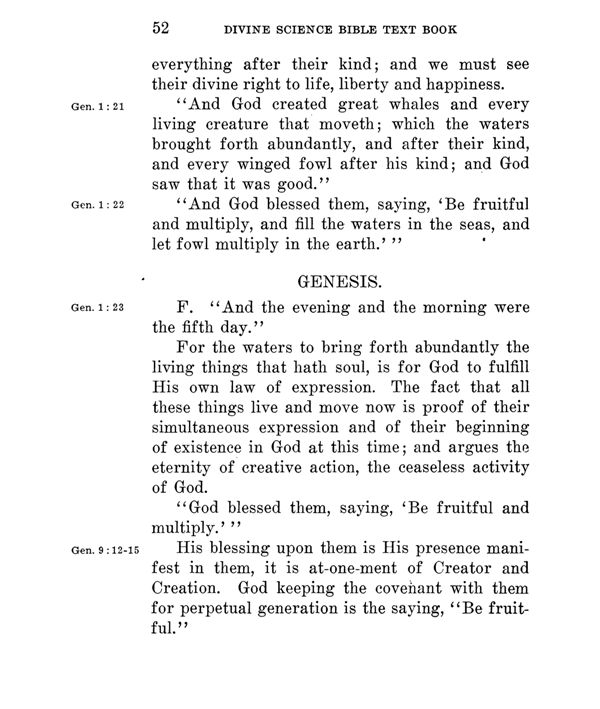 For the waters to bring forth abundantly the living things that bath soul, is for God to fulfill His own law of expression. The fact that all these things live and move now is proof of their simultaneous expression and of their beginning of existence in God at this time; and argues the eternity of creative action, the ceaseless activity of God.
