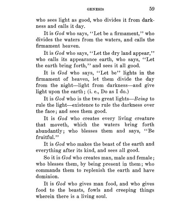 It is God who says, "Let the dry land appear," who calls its appearance earth, who says, "Let the earth bring forth," and sees it all good. It is God who says, "Let be" lights in the firmament of heaven, let them divide the day from the night --- light from darkness --- and give light upon the earth; (i. e., Do as I do.)
