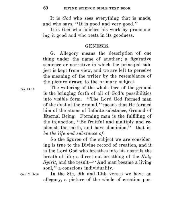 The watering of the whole face of the ground is the bringing forth of all of God's possibilities into visible form. " The Lord God formed man of the dust of the ground," means that He formed him of the atoms of Infinite substance, Ground of Eternal Being. Forming man is the fulfilling of the injunction, "Be fruitful and multiply and replenish the earth, and have dominion," --- that is,be the life and substance of.