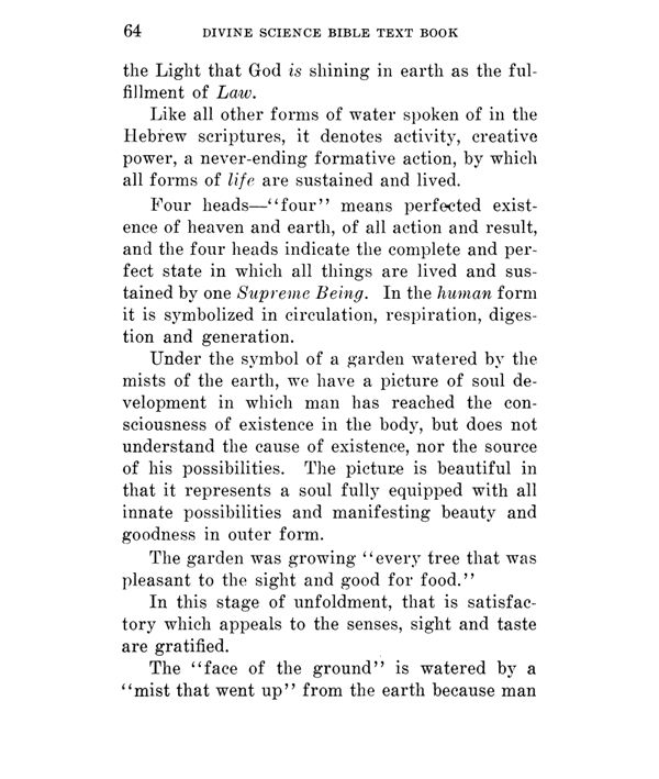 Under the symbol of a garden watered by the mists of the earth, we have a picture of soul development in which man has reached the consciousness of existence in the body, but does not understand the cause of existence, nor the source of his possibilities. The picture is beautiful in that it represents a soul fully equipped with all innate possibilities and manifesting beauty and goodness in outer form.