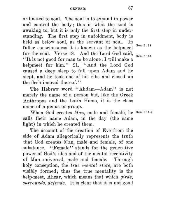 The account of the creation of Eve from the side of Adam allegorically represents the truth that God creates Man, male and female, of one substance. "Female" stands for the generative power of God's idea and of the mental receptivity of Man universal, male and female. Through holy conception, the true mental state, are both visibly formed; thus the true mentality is the help-meet, Ahzar, which means that which girds, surrounds, defends. It is clear that it is not good