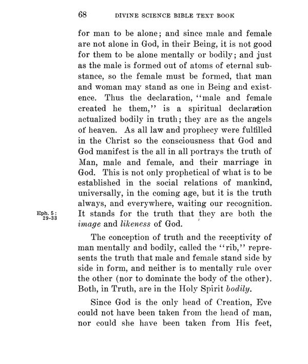 for man to be alone; and since male and female are not alone in God, in their Being, it is not good for them to be alone mentally or bodily; and just as the male is formed out of atoms of eternal substance, so the female must be formed, that man and woman may stand as one in Being and existence. Thus the declaration, "male and female created he them," is a spiritual declaration actualized bodily in truth; they are as the angels of heaven. As all law and prophecy were fulfilled in the Christ so the consciousness that God and God manifest is the all in all portrays the truth of Man, male and female, and their marriage in God. This is not only prophetical of what is to be established in the social relations of mankind, universally, in the coming age, but it is the truth always, and everywhere, waiting our recognition.