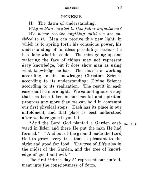 We never receive anything until we are entitled to it. Man can receive this new light, in which is to spring forth his conscious power, his understanding of limitless possibility, because he has done what he could. The mist going up and watering the face of things may not represent deep knowledge, but it does show man as using what knowledge he has. The church is working according to its knowledge; Christian Science according to its understanding; Divine Science according to its realization. The result in each case shall be more light. We cannot ignore a step that has been taken in our mental and spiritual progress any more than we can hold in contempt our first physical steps. Each has its place in our unfoldment, and that place is best understood after we have gone beyond it.