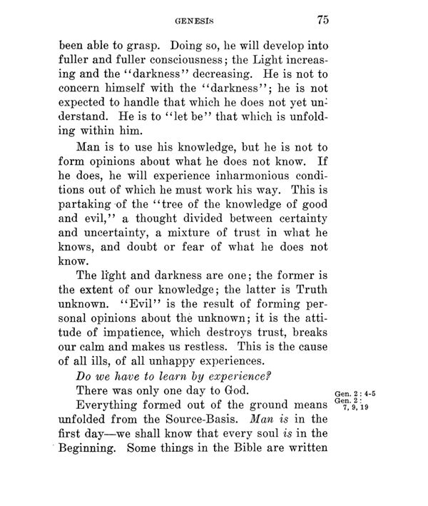 Man is to use his knowledge, but he is not to form opinions about what he does not know. If he does, he will experience inharmonious conditions out of which he must work his way. This is partaking 'of the "tree of the knowledge of good and evil," a thought divided between certainty and uncertainty, a mixture of trust in what he knows, and doubt or fear of what lie does not know.