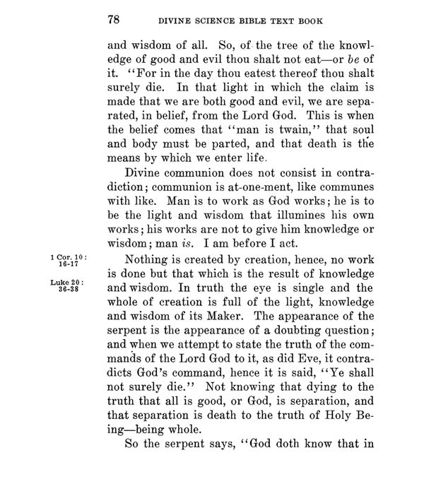 Nothing is created by creation, hence, no work is done but that which is the result of knowledge and wisdom. In truth the eye is single and the whole of creation is full of the light, knowledge and wisdom of its Maker. The appearance of the serpent is the appearance of a doubting question; and when we attempt to state the truth of the commands of the Lord God to it, as did Eve, it contradicts God's command, hence it is said, "Ye shall not surely die." Not knowing that dying to the truth that all is good, or God, is separation, and that separation is death to the truth of Holy Being --- being whole.