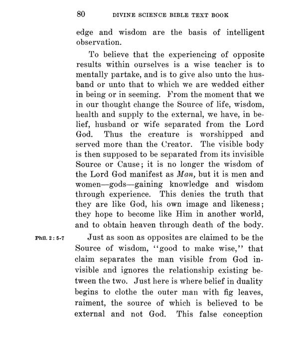 Just as soon as opposites are claimed to be the Source of wisdom, "good to make wise," that claim separates the man visible from God invisible and ignores the relationship existing between the two. Just here is where belief in duality begins to clothe the outer man with fig leaves, raiment, the source of which is believed to be external and not God. This false conception
