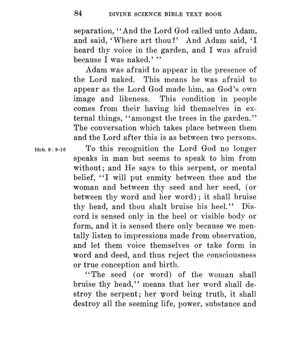 To this recognition the Lord God no longer speaks in man but seems to speak to him from without; and He says to this serpent, or mental belief, "I will put enmity between thee and the woman and between thy seed and her seed, (or between thy word and her word); it shall bruise thy head, and thou shalt bruise his heel." Discord is sensed only in the heel or visible body or form, and it is sensed there only because we mentally listen to impressions made from observation, and let them voice themselves or take form in word and deed, and thus reject the consciousness or true conception and birth.