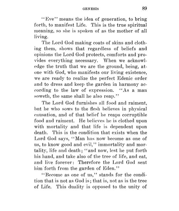"Eve" means the idea of generation, to bring forth, to manifest Life. This is the true spiritual meaning, so she is spoken of as the mother of all living.