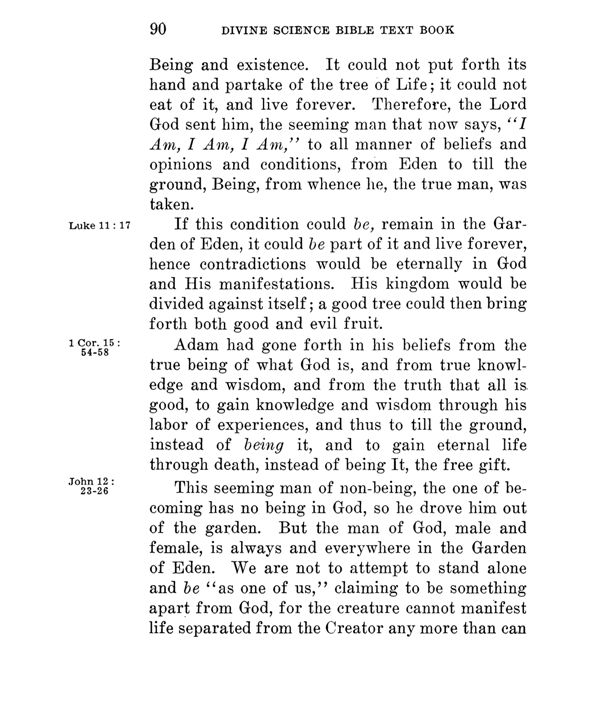 Being and existence. It could not put forth its hand and partake of the tree of Life; it could not eat of it, and live forever. Therefore, the Lord God sent him, the seeming man that now says, "I Am, I Am, I Am," to all manner of beliefs and opinions and conditions, from Eden to till the ground, Being, from whence he, the true man, was taken.
