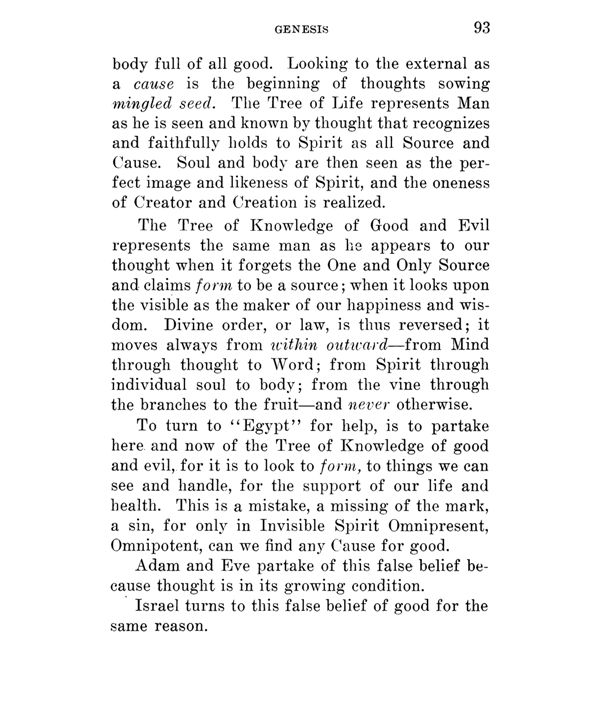body full of all good. Looking to the external as a cause is the beginning of thoughts sowing mingled seed. The Tree of Life represents Man as he is seen and known by thought that recognizes and faithfully holds to Spirit as all Source and Cause. Soul and body are then seen as the perfect image and likeness of Spirit, and the oneness of Creator and Creation is realized.